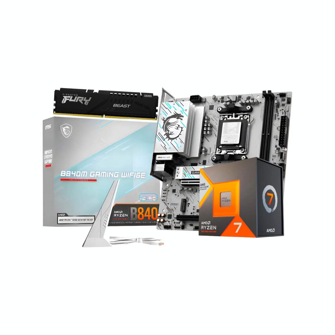 Conteúdo da Embalagem: 1x Processador AMD Ryzen 7 7800X3D (Box), 1x Placa Mãe MSI B840M GAMING WIFI6, 1x Módulo/Kit Memória Kingston 16GB DDR5 5200Mhz.